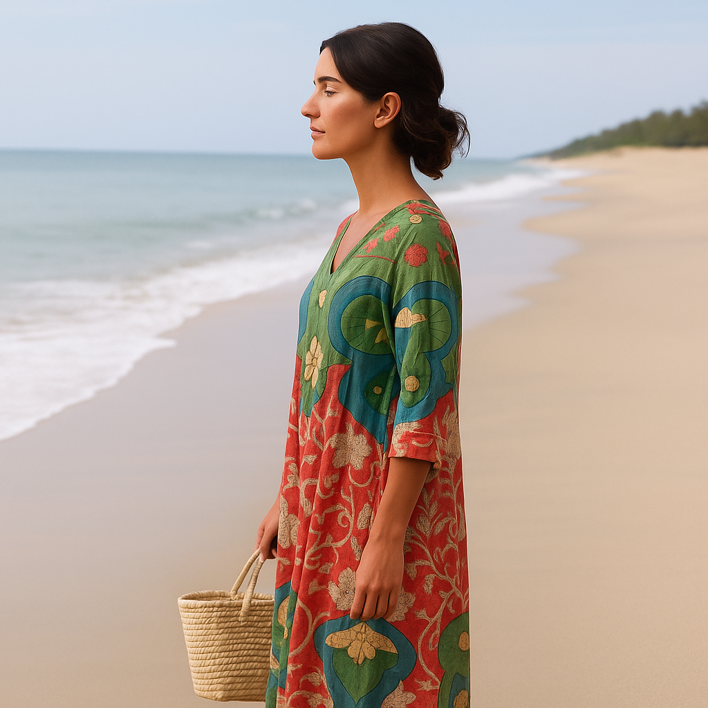 Este elegante vestido casual combina padrões vibrantes com uma silhueta descontraída, tornando-o ideal tanto para passeios à beira-mar como para saídas diárias. Com o seu decote em V, mangas três quartos e saia esvoaçante, equilibra o conforto com um charme atraente.